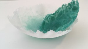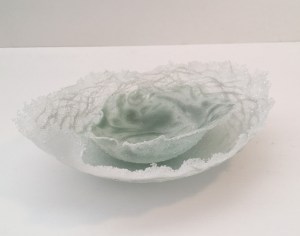 Each work is individually made, the patterns inscribed into tablets of plaster. The relief is filled with powdered glass and backfilled with glass fritt the size of sugar crystals. The first firing in a kiln forms a flat sheet of glass and a second lower temperature firing shapes the vessels. It takes over two days to make each set.
